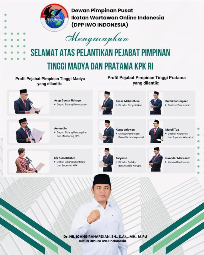 JAKARTA – // RaiderNet.id // 20 Februari 2026 – Ketua Umum Ikatan Wartawan Online (IWO) Indonesia memberikan apresiasi dan ucapan selamat atas dilantiknya sembilan pejabat strategis di lingkungan Komisi Pemberantasan Korupsi (KPK) Republik Indonesia. Pelantikan yang berlangsung pada rentang waktu 18 dan 20 Februari 2026 ini merupakan langkah krusial dalam penguatan struktur organisasi lembaga antirasuah tersebut.