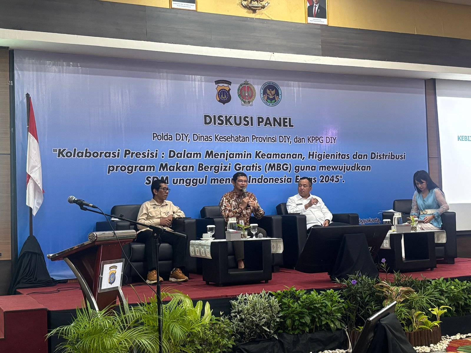 Diskusi panel ini menghadirkan sejumlah narasumber, di antaranya Irwasda Polda DIY Kombes Pol I Gusti Ngurah Rai Mahaputra, S.I.K., M.H., Kepala Dinas Kesehatan DIY dr. Gregorius Anung Trihadi, M.P.H., serta Kepala Kantor Pelayanan Pemenuhan Gizi (KPPG) Region DIY Harosno Budi Waluyo.