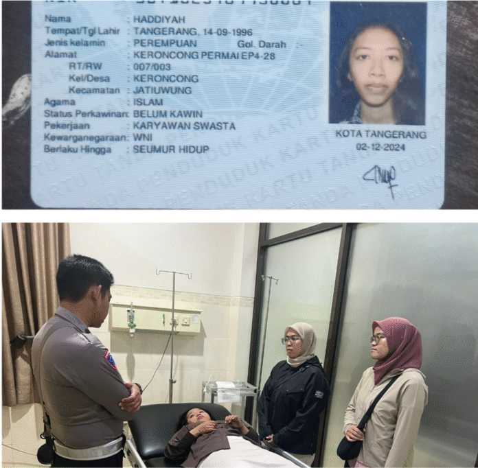 “Akibat kecelakaan tersebut Pembonceng Sepeda motor Honda Beat No.Pol. AB 5510 IW, A.n. Haddiyah, Perempuan, Tangerang, 14-09-1996, Islam, Karyawan Swasta, alamat Kroncong Permai, 04/28 , Jatiuwung, Tangerang Kota, mengalami luka patah kaki kiri, kondisi sadar dan saat ini dirawat di RS Nur Rohmah Playen.